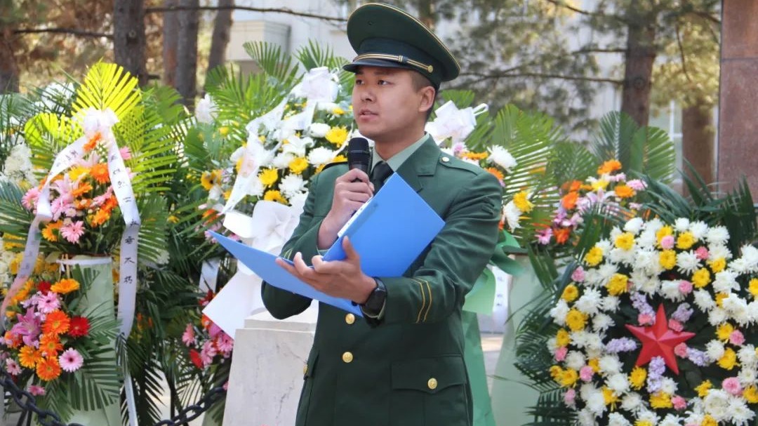 退役大学生士兵协会副主席卜祥睿代表全体成员致纪念词。革命前辈的精神将化作大家前进的动力,让青春在祖国需要的地方绽放绚丽之花。
