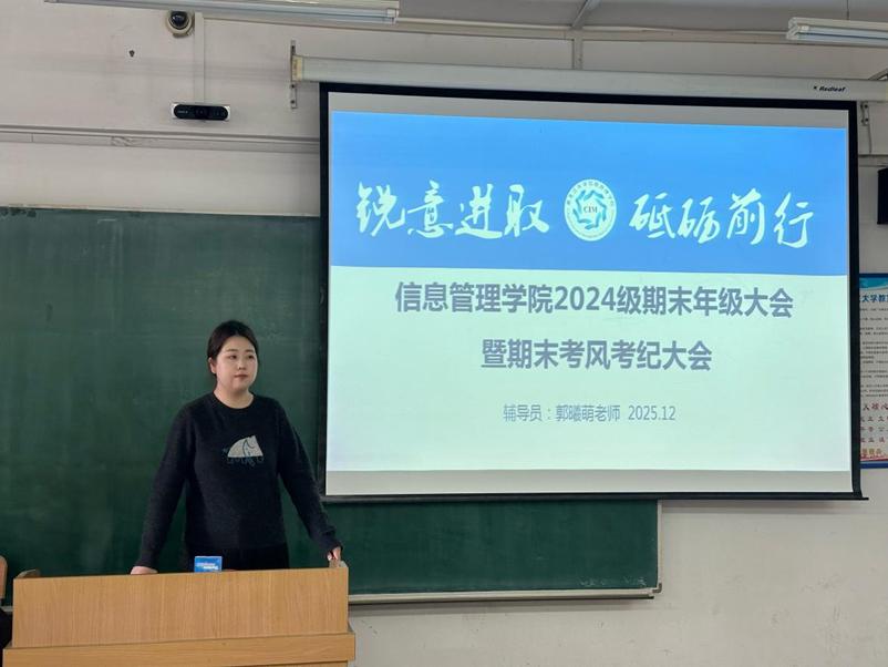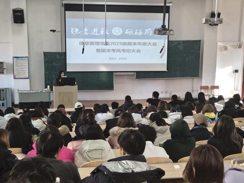 为进一步筑牢优良学风班风建设根基,切实保障期末各项工作平稳有序推进,信息管理学院各年级于2025年12月16日至12月22日陆续召开考风考纪教育大会暨假期安全教育大会。会议由各年级辅导员主持,全体同学参会。