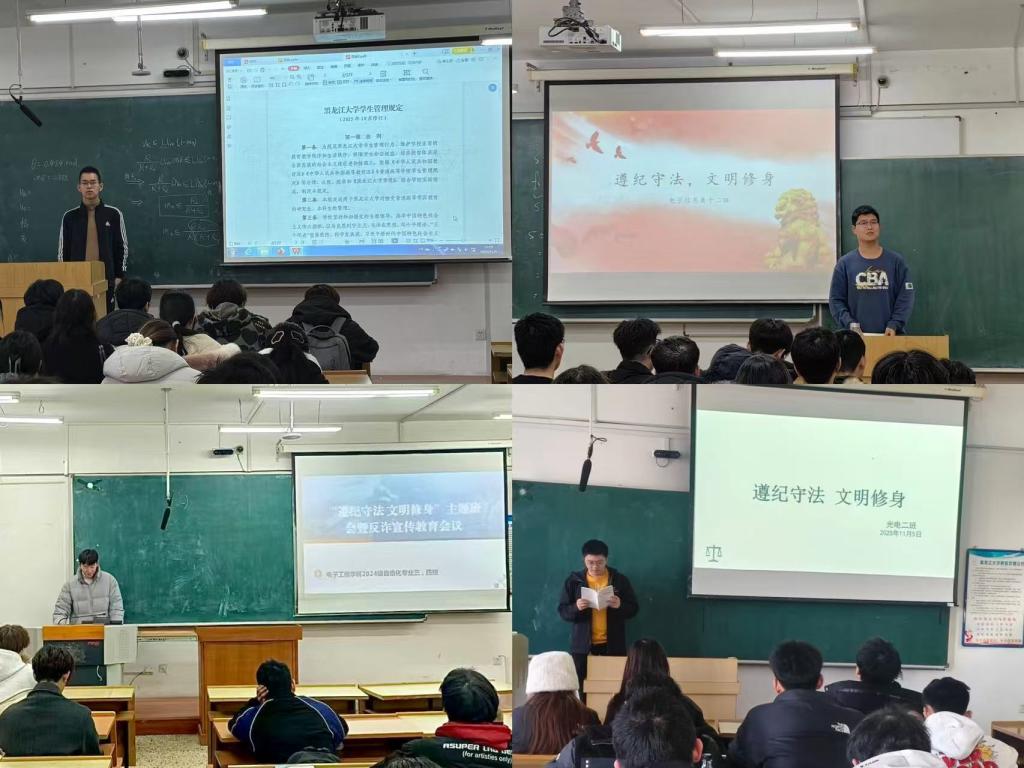 为进一步加强学生教育管理,引导学生自觉遵守法律法规和校纪校规,强化学生规则意识与安全防护能力,电子工程学院于11月中旬在全体学生中组织开展“遵纪守法,文明修身”主题班会,围绕2025版《黑龙江大学学生管理规定》解读、反诈安全教育、医保政策解读等内容,为学生成长构建思想与安全保障体系。