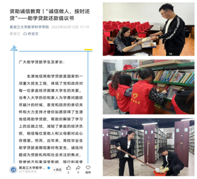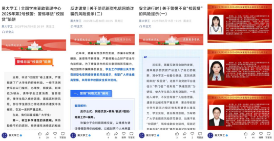 学校依托“黑大学工”微信公众号,在“资助诚信教育”“反诈课堂”“安全进行时”等专栏,围绕毕业还款、不良校园贷预防、反诈骗等内容,以图文并茂、案例剖析等多元形式制作优质宣传内容,提升学生金融风险辨识能力。开设“榜样力量——国家奖学金获奖者风采展示”专题栏目,生动展现获奖学生在学术研究、科技创新、社会实践等领域的奋斗历程与突出成就。此外,各学院挖掘活动亮点,通过专题报道、心得分享等形式,全方位展示资助诚信教育活动成果,让“诚信立德,诚信立身”理念深入人心。截至目前,学校及学院各宣传平台累计发布相关资讯100余篇,总阅读量超60000次。