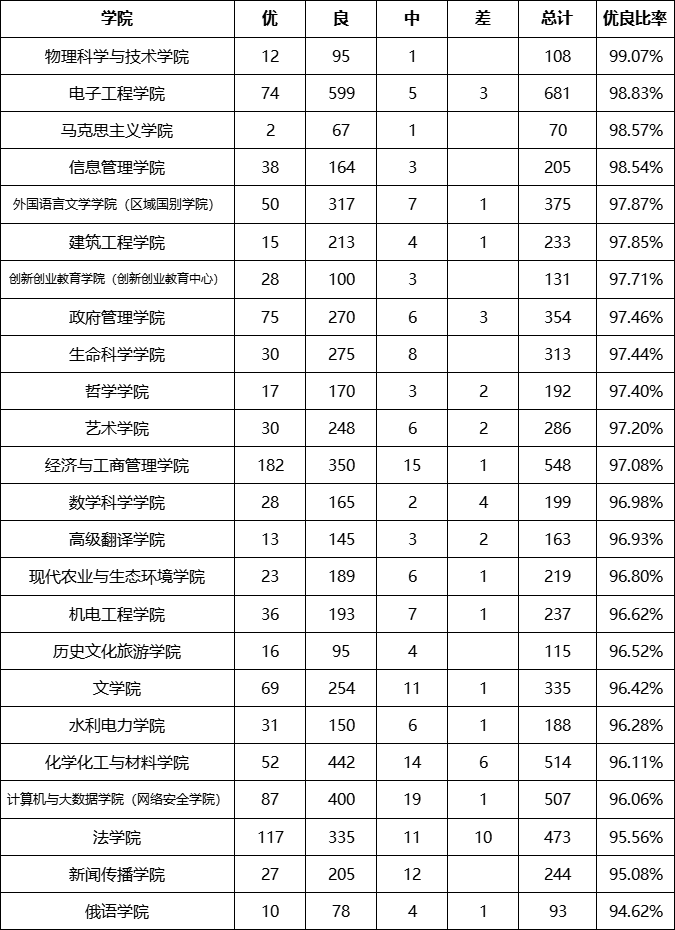 本次共检查6274间寝室(其中本科生寝室4438间,研究生寝室1836间),经检查优秀1003间,良好5089间,中等143间,差评39间,优良比率97.10% 。现将学院检查结果公布如下: