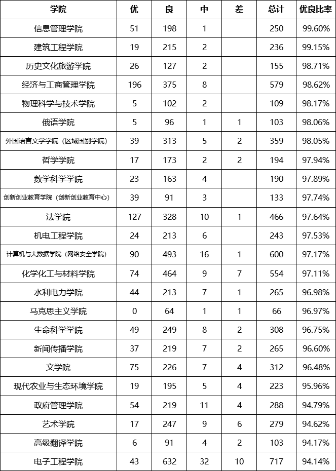 本次共检查6483间寝室(其中本科生寝室4598间,研究生寝室1885间),经检查优秀1033间,良好5258间,中等143间,差评49间,优良比率97.04% 。现将学院检查结果公布如下: