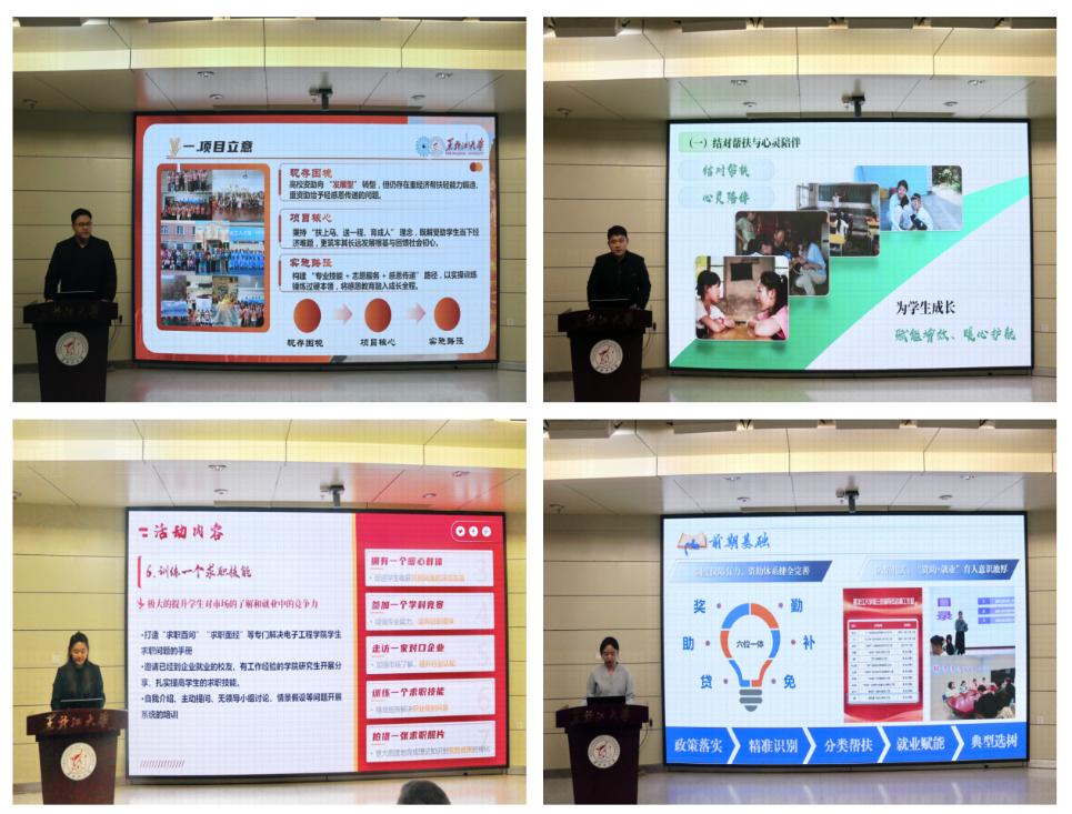 答辩会上,各项目答辩老师就项目背景、核心设计理念、具体实施方案、创新特色亮点及预期建设成效等维度进行了PPT展示汇报,从“成长赋能工作坊”到“研学计划”、从“资助政策宣传”到“爱心志愿服务队”,每一个项目都是学院精心打磨的“育人作品”,充分彰显了各活动项目的实践应用价值与创新发展潜力,也展示着我校资助育人工作的厚度与温度。