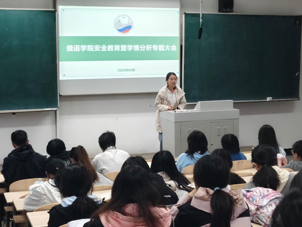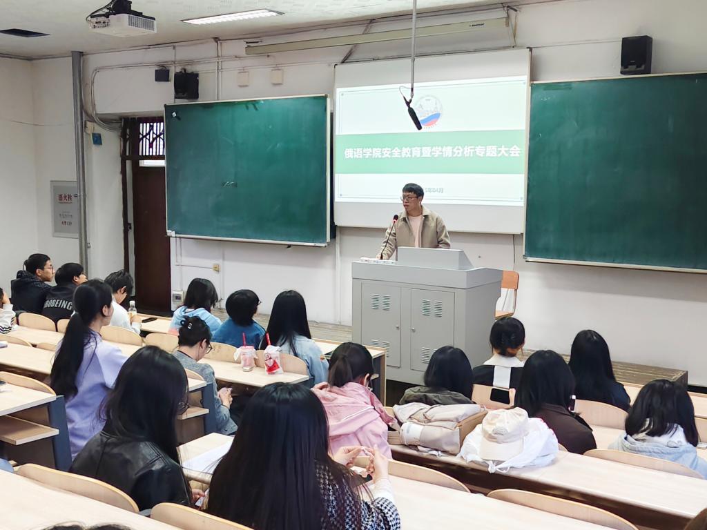 为强化学生安全责任意识,严明校规校纪,营造良好学风院风,有效促进学生身心健康成长,2025年4月28日17:30,俄语学院组织学生在2号楼400教室召开安全教育暨学情分析专题大会,本次大会由俄语学院党委副书记张爽、辅导员李宏磊、马禹茜主讲,学院2022级、2023级、2024级本科生参加。