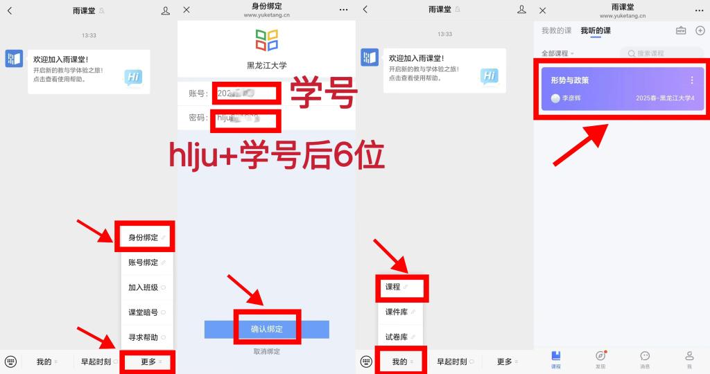 第二步:进入【雨课堂】微信公众号-【更多】-【身份绑定】,选择“黑龙江大学”进入绑定页面:用户名:学号(例:20221000);密码:hlju加学号后6位(例:hlju221000)