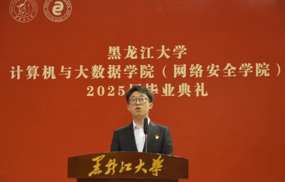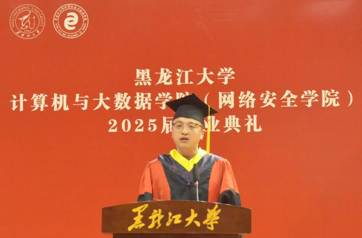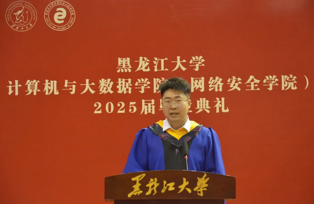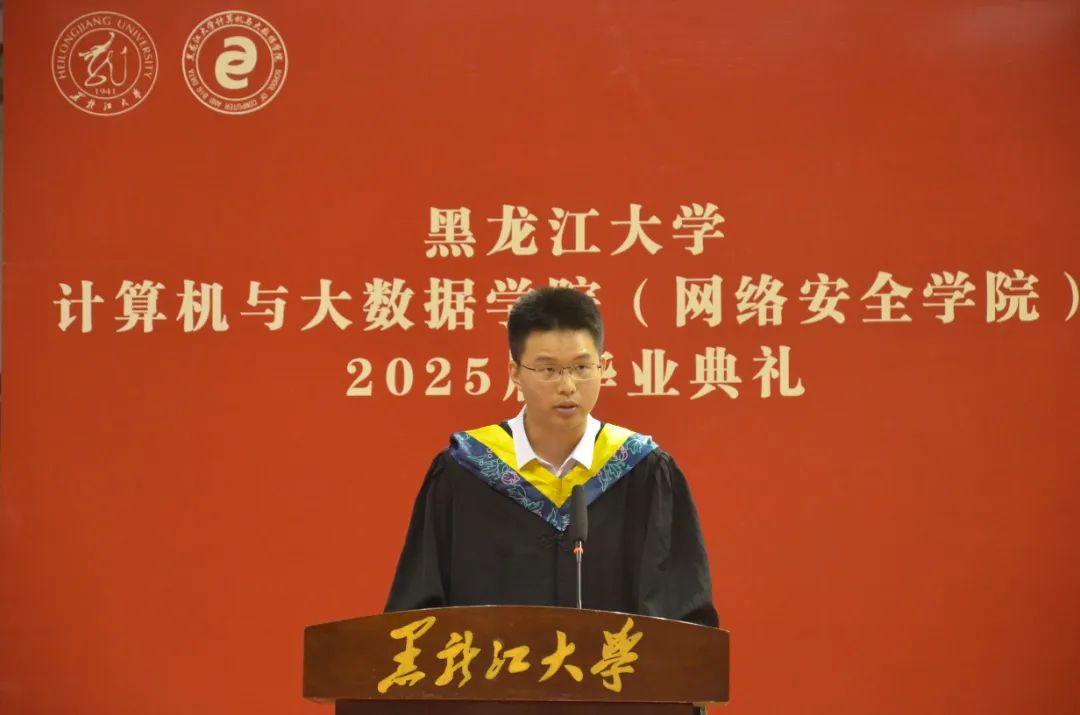 研究生毕业生代表2022级计算机科学与技术专业崔延昌、本科毕业生代表2021级网络空间安全专业伍万里分别代表全体研究生与本科毕业生向母校和老师的悉心栽培,亲人和同学的默默支持致以崇高的敬意和衷心的感谢,回忆了在黑大丰富多彩的校园生活,并表示未来必以热忱为帆,用奋斗奔赴新征程。